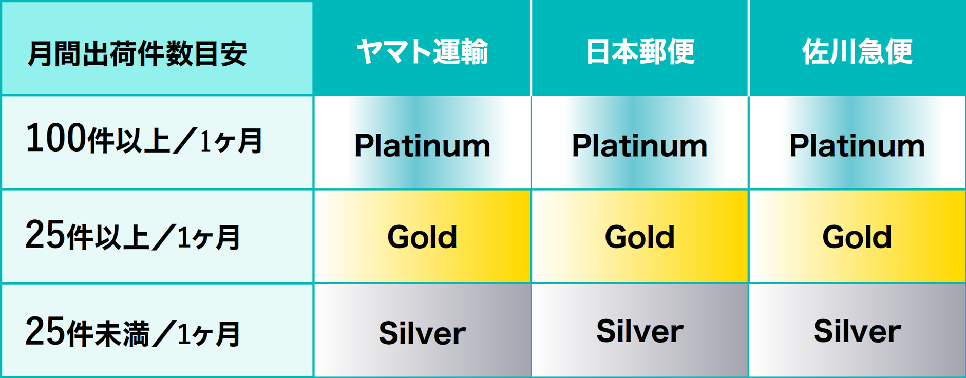 - Goldプラン:過去3回分(3か月分)の請求サイクルで出荷件数75件以上/3か月の事業者様(月間出荷件数平均25個以上)