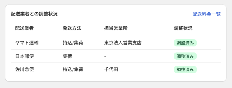 配送業者との調整状況は、アプリサイドメニュー「発送元情報・配送料」より確認されたい発送元をご選択いただくと、下記画面にてご確認いただけます。